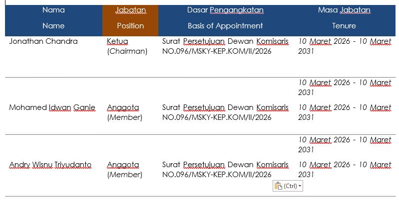 Perseroan telah menyusun Piagam Komite Audit (Audit Committee Charter) sebagai pedoman bagi Komite Audit dalam melaksanakan tugas dan tanggung jawabnya secara efisien dan efektif. Piagam tersebut telah dimutakhirkan dan disahkan terakhir kali oleh Dewan Komisaris berdasarkan Surat Keputusan Dewan Komisaris No. 020/MSKY-Kep. Kom/III/17 tanggal 16 Maret 2017. Perseroan telah memperpanjang masa jabatan anggota Komite Audit hingga tanggal 15 Maret 2022. Pedoman Kerja tersebut mencakup struktur keanggotaan, persyaratan keanggotaan termasuk persyaratan kompetensi dan independensi, tugas, tanggung jawab dan wewenang, serta rapat, pelaporan dan anggaran.